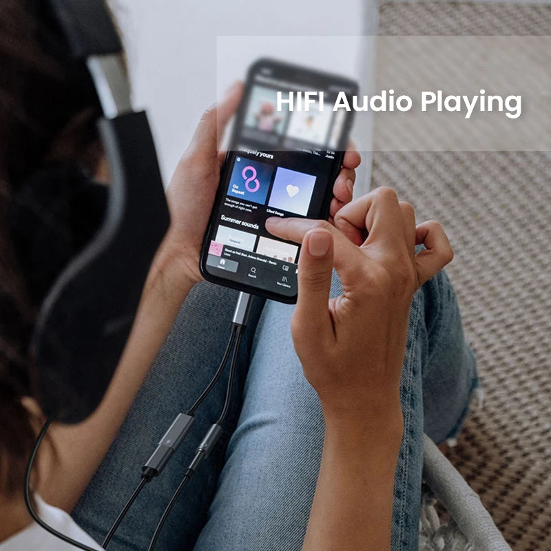 2-in-1 USB-C to 3.5mm headphone jack and charging adapter.