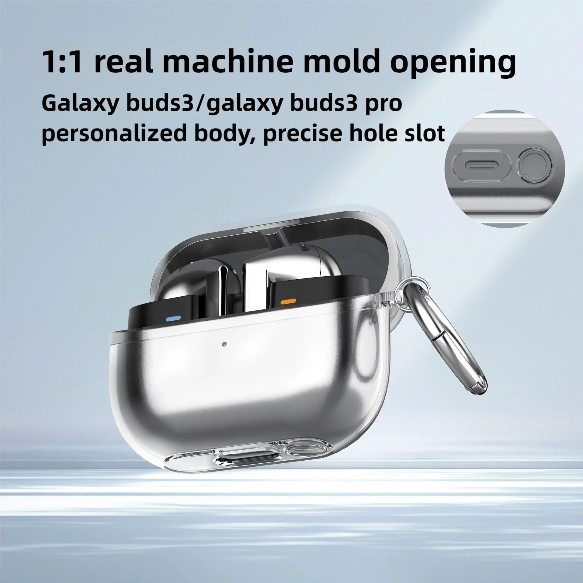 Clear transparent earphone case designed for Samsung Galaxy Buds 3 and Buds 3 Pro, offering shockproof protection against drops and scratches while maintaining a slim fit and showcasing the original design.