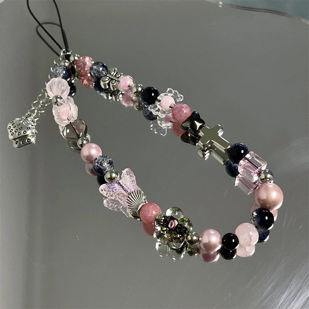 Y2K Pink Beaded Flower Butterfly Phone Charm Bracelet for iPhone