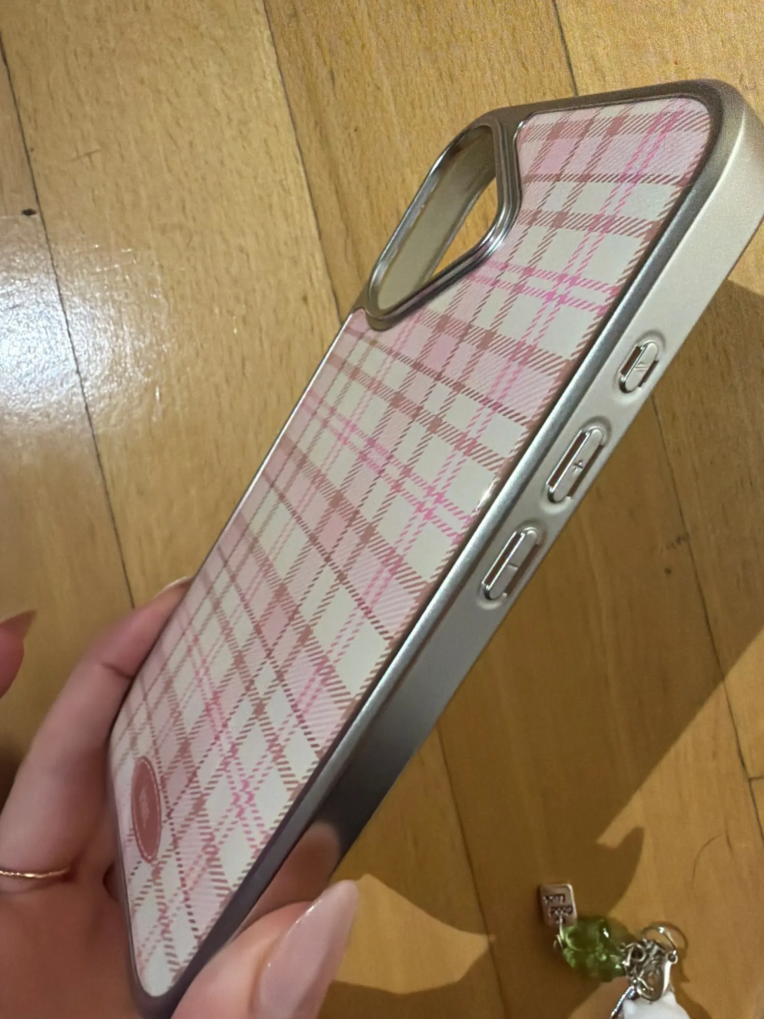 Korean Girly Checker Pattern Electroplated Leather Texture Case for iPhone 16 15 14 Pro Max