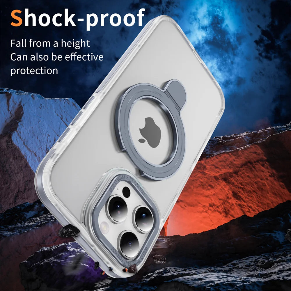 Showcase your iPhone with this luxury clear magnetic stand phone case. Built-in metal ring bracket folds for easy hands-free viewing anywhere. Strong MagSafe magnets ensure stable wireless charging connection. Shockproof edges and reinforced corners offer all-around protection. Compatible with iPhone 17, 16, 15, 14, 13, 12, and 11 Pro Max models.