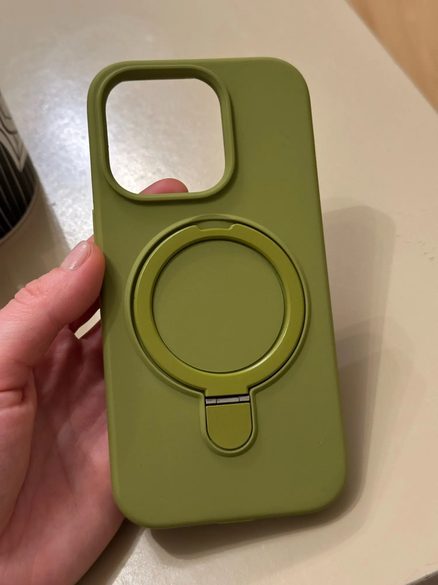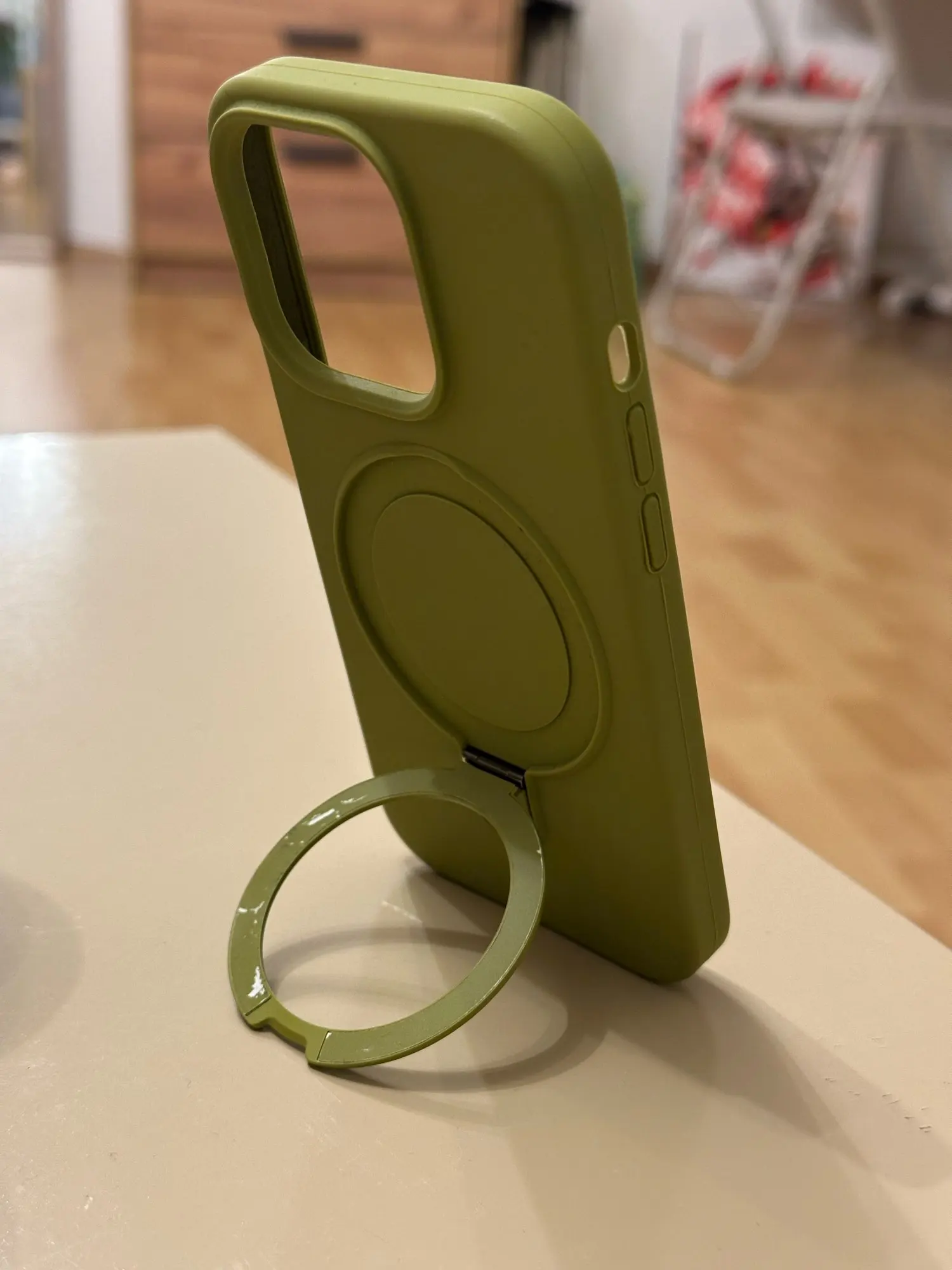 Elegant liquid silicone MagSafe case with built-in rotating ring holder. Soft matte finish, shockproof design, and magnetic charging compatible. Premium style and protection.