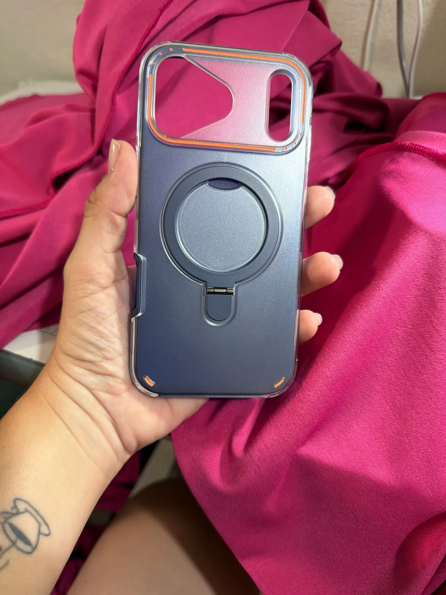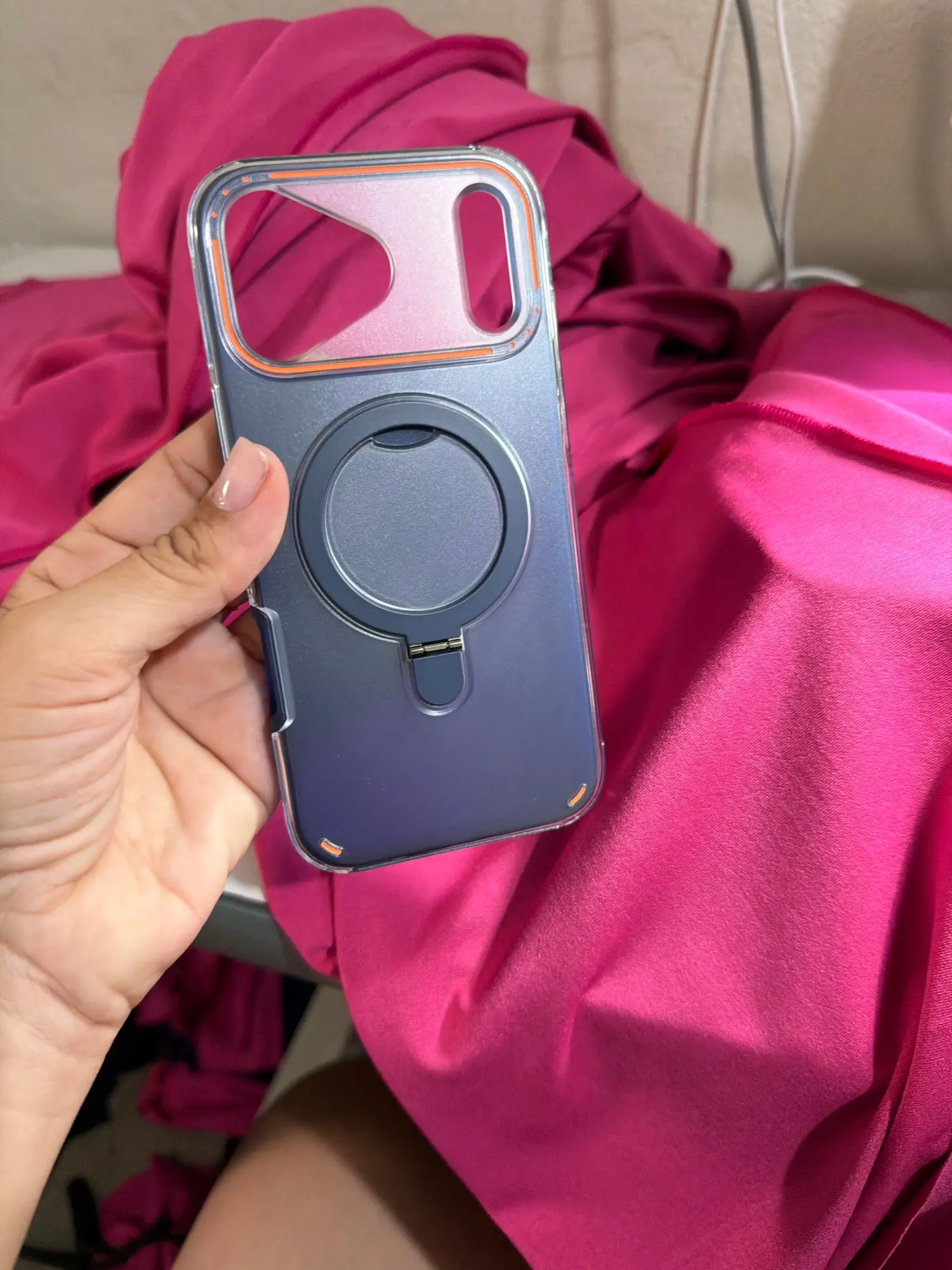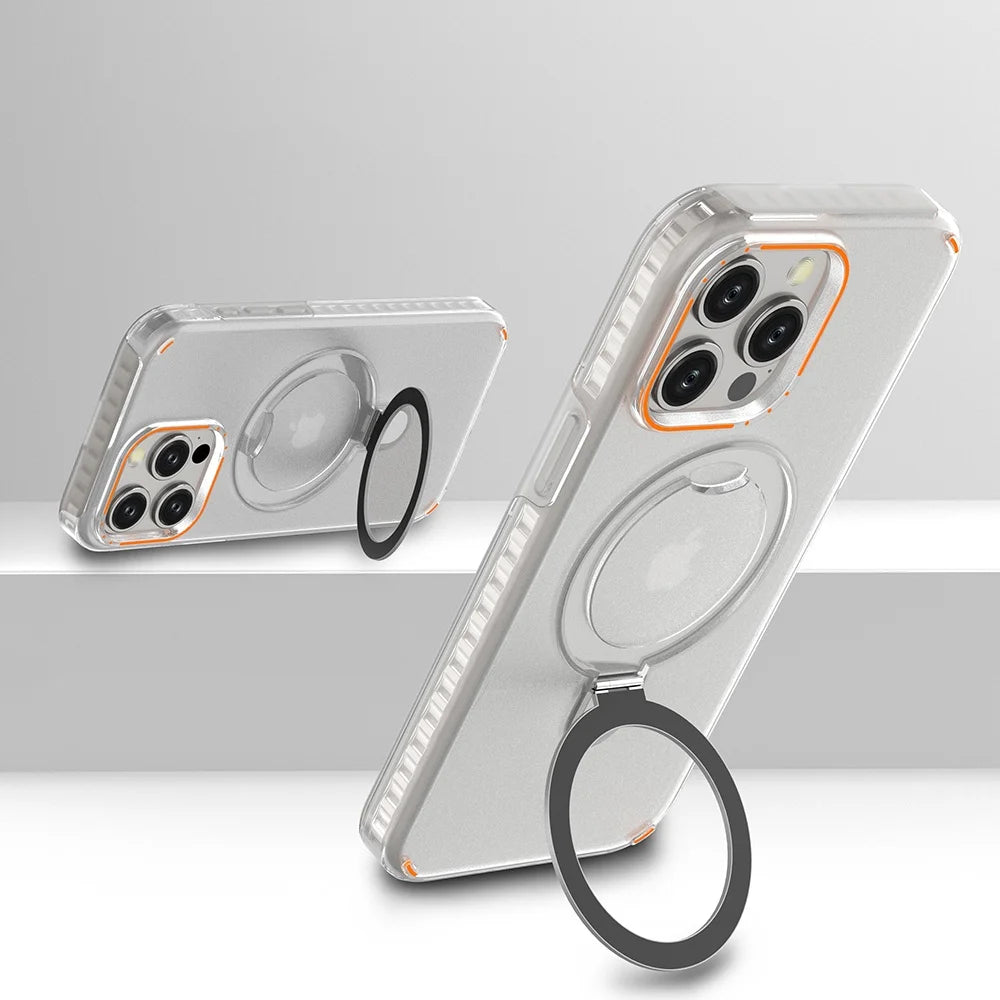Experience premium style with this luxury matte magnetic clear case. Built-in metal ring stand offers convenient hands-free viewing. Strong MagSafe magnets ensure fast and stable wireless charging. Frosted back design resists fingerprints and enhances grip.