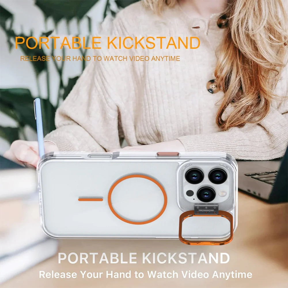 Protect your iPhone with this original MagSafe clear acrylic phone case. Compatible with iPhone 17, 16E, 16, 15, 14, 13, 12, and 11 Pro Max Plus models. Features an invisible lens stand holder for hands-free viewing anytime. Strong magnetic alignment supports fast and stable MagSafe charging. Slim, transparent, and shockproof—perfect for clean everyday protection.