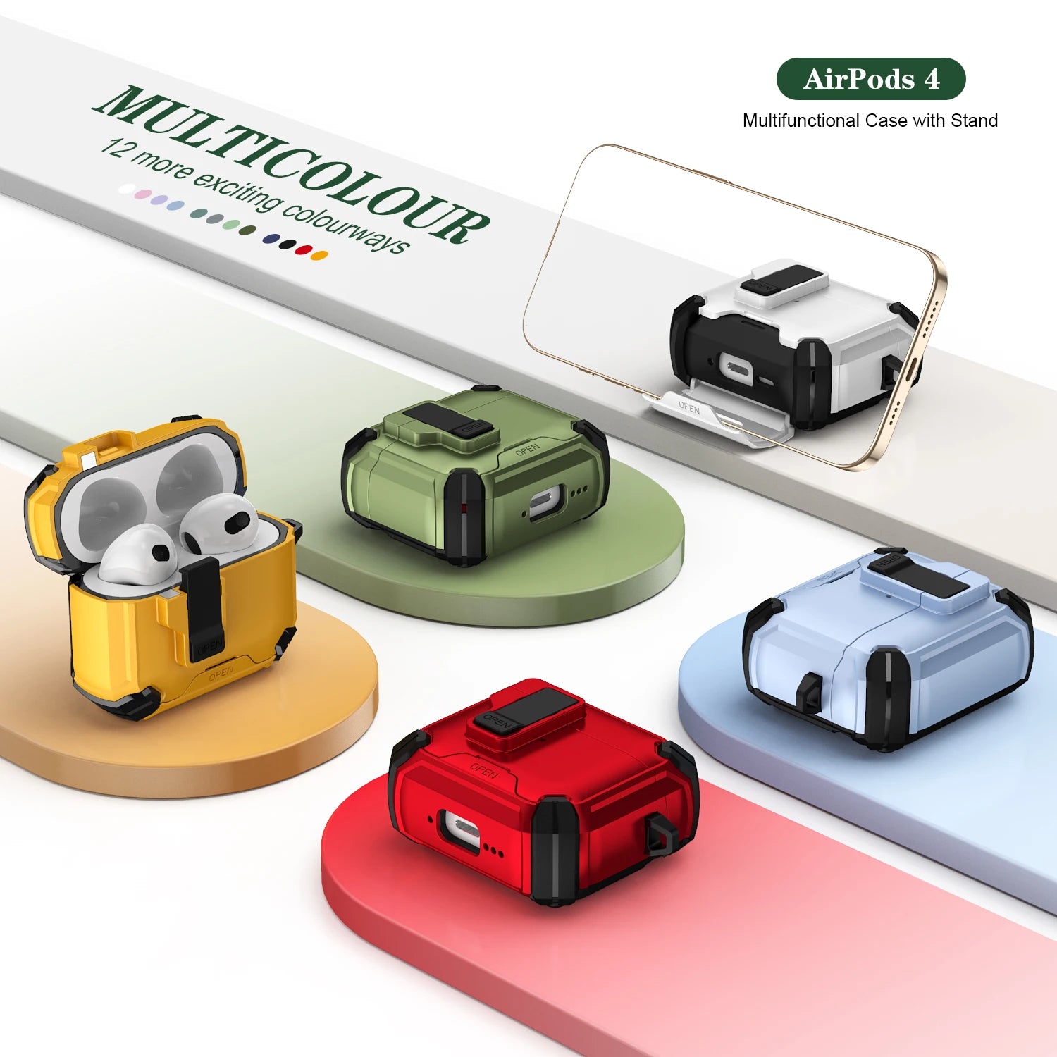 Protect your AirPods with this secure lock shockproof case featuring a phone holder and convenient hook. Compatible with AirPods 1, 2, 3, 4, and Pro models.