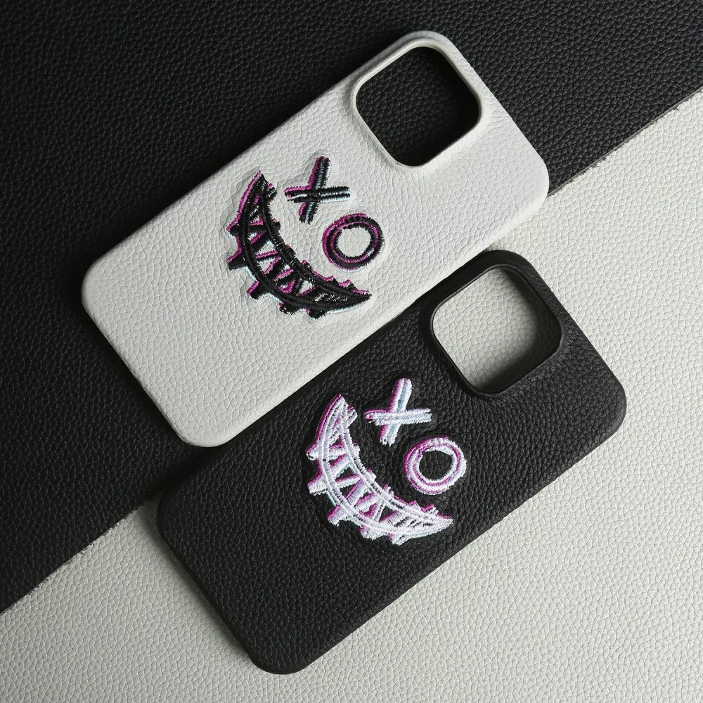 Premium genuine leather phone case with elegant embroidery. Offers durable back protection for iPhone 11 through 16 Pro Max models with a sophisticated look.