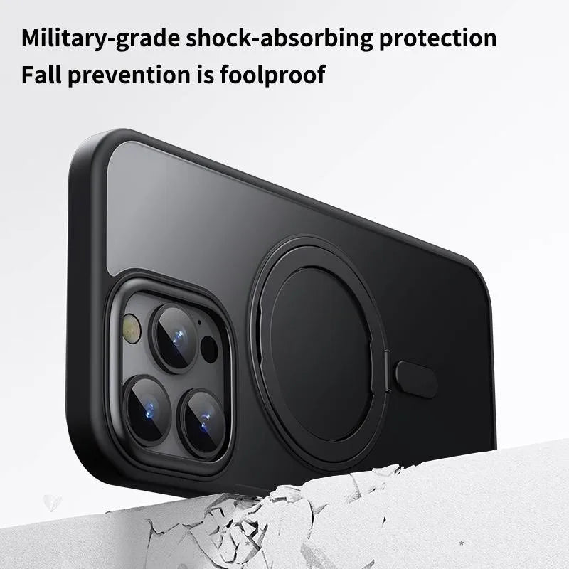 Show off your iPhone with this transparent magnetic MagSafe protective case. Compatible with iPhone 17 Pro Max, 16 Plus, 15, and 14 models. Features a 360° rotating bracket for hands-free viewing convenience. Shockproof design with reinforced corners ensures all-around protection. Clear, stylish, and perfectly aligned for MagSafe wireless charging.