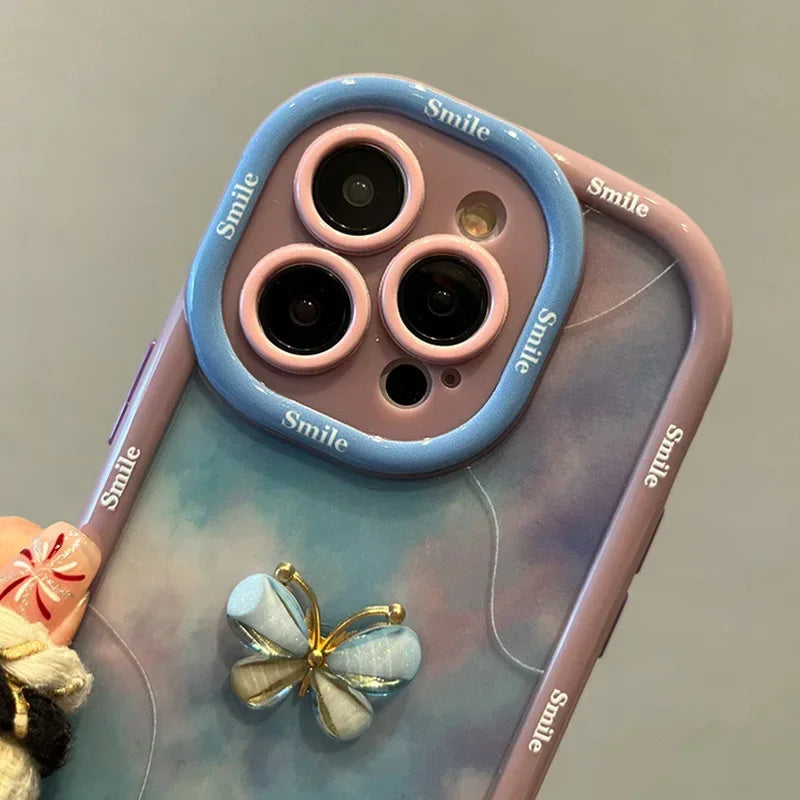 Elevate your phone's style with this wrist chain lanyard phone case. Featuring a cute 3D bow and butterfly design with a unique ink and wash smudge pattern, this case blends fashion and function.